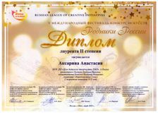- Аксарина Анастасия, солистка образцового ансамбля русской песни «Млада» (руководитель Похилько Л.И., концертмейстер Похилько В.Ф.) – Лауреат II степени в номинации «Народный вокал. Соло», 2 возрастная категория, 8-11 лет.