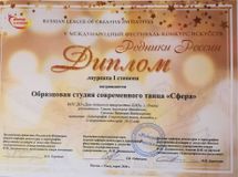- образцовая студия современного танца «Сфера» (руководитель – Савина А.М., педагог дополнительного образования – Савченко В.В.) – Лауреат I степени в номинации «Хореография. Современный танец. Ансамбль», 2-я возрастная категория, 10-12 лет;