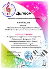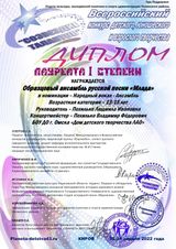Дипломами «Лауреат» в номинации «Вокальное ансамблевое пение» в 2022 г. была награждена старшая группа образцового ансамбля русской песни «Млада»: