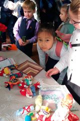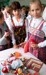 Наши ребята (учащиеся первых – пятых классов), первый год занимающиеся в кружке «Шкатулка мастера» (руководитель кружка «Шкатулка мастера» Т.Ф. Журавок, педагог Дома детского творчества Ленинского административного округа), стали активными участниками события. Они ответственно и с вдохновением готовились к ярмарке, создавая своими руками поделки, которые научились делать в течение месяца. Наш выставочный стол получился ярким, нарядным – на кружевной скатерти дружно разместились куколки-обереги: «Колокольчик» (куколка добрых вестей), «Подорожницы», «Пеленашки», а также шляпки-игольницы, цветы из креповой бумаги, сувениры, свалянные из шерсти.