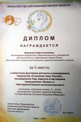 В 2023 году достижения Софьи на конкурсах и фестивалях порадовали нас своими высокими результатами, она принимала участие в 9 международных, всероссийских, областных, городских конкурсах и фестивалях: