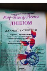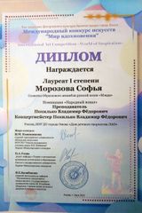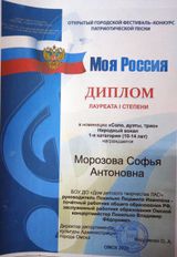На всех конкурсах в номинации «Сольное народное исполнительство» Морозова Софья стала Победителем — Лауреатом I, II, III степени.
