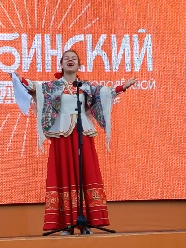 А солистка младшего возрастного состава Михайловова Анастасия показала большую артистичность и запомнилась зрителям звонким, высоким голосом в песне «Новая калинка» в обработке Марии Мордасовой!
