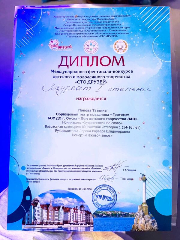 14.03.2026 г. солистка Образцового театра праздника «Гротеск» Попова Таня впервые представила на публике драматическую работу по рассказу Н. Тэффи «Неживой зверь» — и сразу на престижном Международном конкурсе‑фестивале «Сто друзей»!